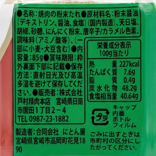 名称 焼肉の粉末たれ 原材料名 粉末醤油(デキストリン、醤油、食塩)(国内製造)、天日塩、胡椒、砂糖、にんにく粉末、唐辛子/カラメル色素、調味料(アミノ酸等)、(一部に小麦・大豆含む) 内容量 85g 賞味期限 枠外裏面下部に記載 保存方法 直射日光及び高温多湿を避けて保存してください。 販売者 株式会社戸村精肉本店