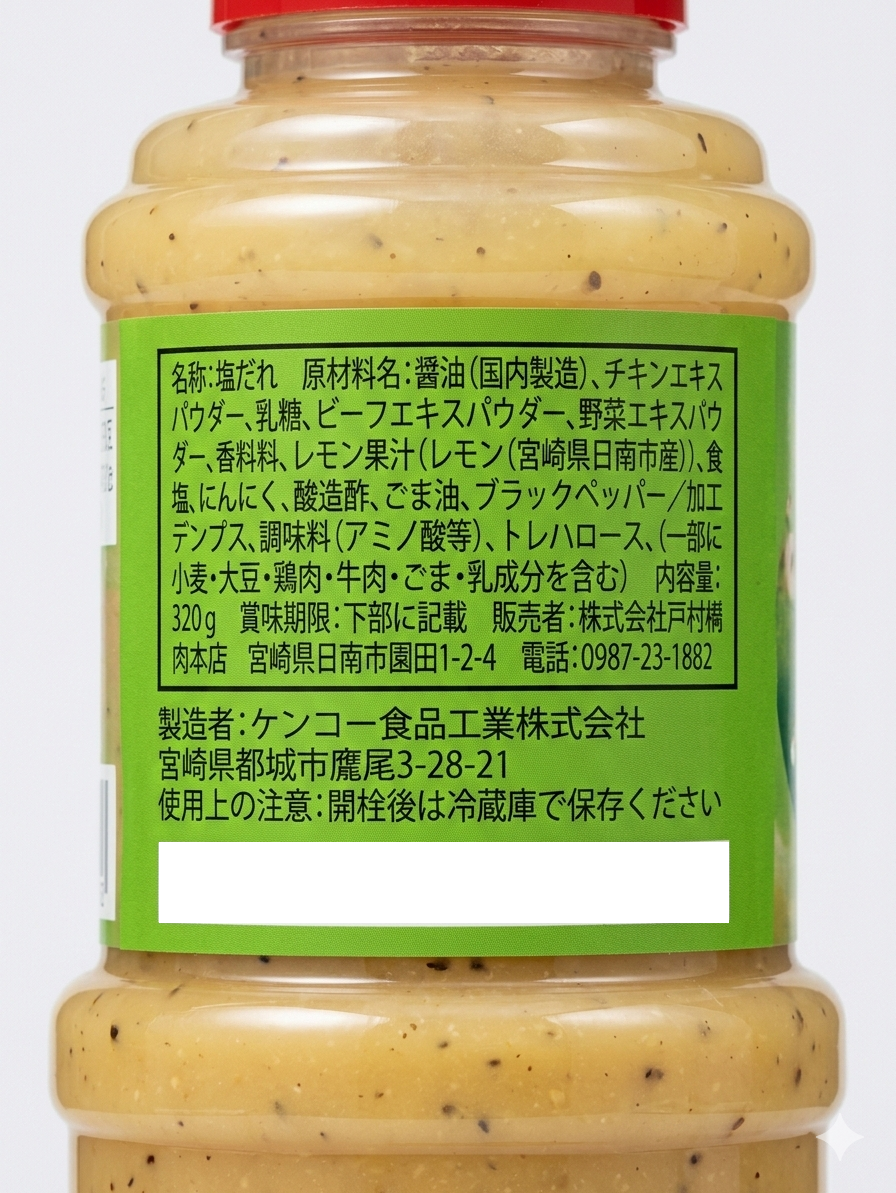 製造者:ケンコー食品工業株式会社名称 塩だれ 原材料名 醤油(国内製造)、チキンエキスパウダー、乳糖、ビーフエキスパウダー、野菜エキスパウダー、香辛料、 レモン果汁(レモン(宮崎県日南市産))、食塩、にんにく、醸造酢、ごま油、ブラックペッパー/加工デンプン、調味料(アミノ酸等)、 トレハロース、(一部に小麦・大豆・鶏肉・牛肉・ごま・乳成分を含む) 内容量 320g 賞味期限 下部に記載 保存方法 開栓後は冷蔵庫で保存ください 販売者 株式会社戸村精肉本店